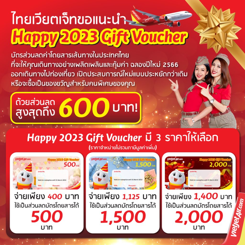 บัตรกำนัล “Happy 2023 Gift Voucher” เป็นบัตรกำนัลใช้แลกเป็นส่วนลดเมื่อสำรองบัตรโดยสารสำหรับเดินทางบนทุกเส้นทางบินภายในประเทศและระหว่างประเทศของไทยเวียตเจ็ท เปิดจำหน่าย 3 รูปแบบ ได้แก่ บัตรกำนัลราคา 400 บาท ใช้แลกส่วนลด 500 บาท บัตรกำนัลราคา 1,125 บาท ใช้แลกส่วนลด 1,500 บาท และบัตรกำนัลราคา 1,400 บาท ใช้แลกส่วนลด 2,000 บาท (ราคาไม่รวมภาษีมูลค่าเพิ่ม) บัตรกำนัลดังกล่าวสามารถใช้แลกเป็นส่วนลดเฉพาะค่าโดยสารสำหรับบัตรโดยสารทุกประเภท (ไม่รวมภาษีและค่าธรรมเนียม) จำกัดการใช้บัตรกำนัล 1 ใบ สำหรับการสำรองบัตรโดยสาร 1 ครั้งต่อผู้โดยสาร 1 ท่าน สามารถส่งต่อบัตรกำนัลดังกล่าวแก่ผู้อื่นได้เนื่องจากไม่มีชื่อระบุ แต่ไม่สามารถใช้แลกเป็นเงินสดได้ บัตรกำนัลดังกล่าววางจำหน่ายและพร้อมให้แลกรับส่วนลดตั้งแต่วันที่ 1 มกราคม 2566 – 31 มีนาคม 2566 เดินทางได้ระหว่างวันที่ 1 กุมภาพันธ์ 2566 – 30 กันยายน 2566 (รวมวันหยุดนักขัตฤกษ์ เงื่อนไขเป็นไปตามที่กำหนด) ที่ www.vietjetair.com