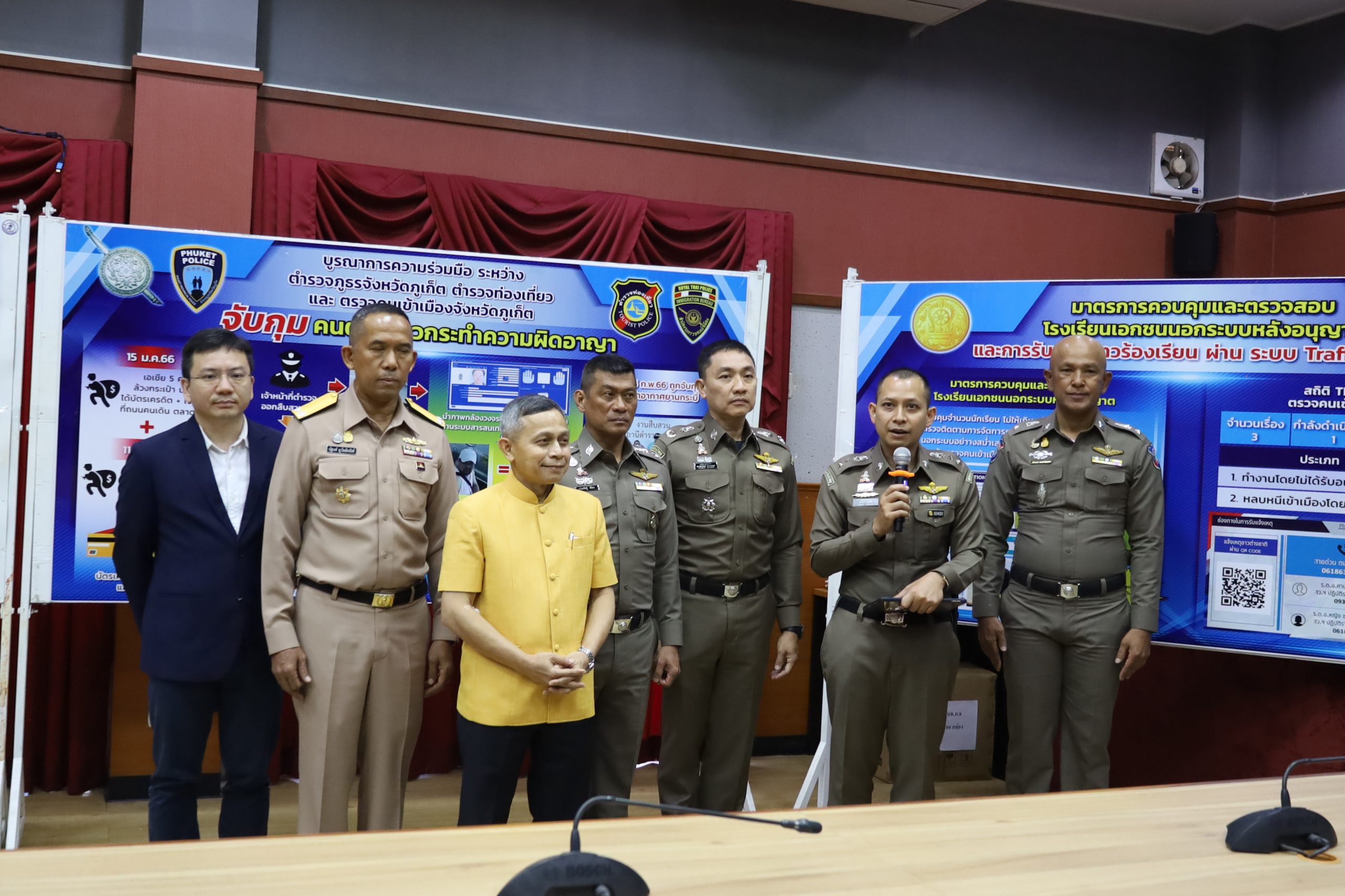 เมื่อวันที่ 1 มีนาคม 2566 เวลา 10.00 น. ที่ห้องประชุมตำรวจภูธรจังหวัดภูเก็ต นายอานุภาพ รอดขวัญ ยอดระบำ รองผู้ว่าราชการจังหวัดภูเก็ต พร้อมด้วยพล.ต.ต.เสริมพันธุ์ ศิริคง ผบก.ภ.จว.ภูเก็ต พล.ต.ต.ประพันธ์ศักดิ์ ประสานสุข ผบก.ตม.6 พล.ร.ต.ณัฐพงศ์ ญาโณทัยขจิตต์ รอง ผอ.รมน.จว.ภูเก็ต พ.ต.อ.ธเนศ สุขชัย ผกก.ตม.จว.ภูเก็ต และหน่วยงานที่เกี่ยวข้อง ร่วมกันแถลงผลการปฎิบัติงานตามนโยบายของนายกรัฐมนตรี กรณีให้มีการตรวจสอบชาวต่างชาติที่มีพฤติกรรมไม่เหมาะสมในขณะที่พำนักอาศัยอยู่ในประเทศไทย กระทำผิดกฎหมาย ก่อเหตุอันตรายต่อความสงบสุขและความปลอดภัยในชีวิตและทรัพย์สินของประชาชน หรือกลุ่มคนร้ายข้ามชาติที่ใช้ประเทศไทยเป็นฐานในการกระทำความผิด ซึ่งกระทบต่อภาพลักษณ์การท่องเที่ยวของประเทศไทย